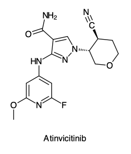Struktur und EigenschaftenAtinvicitinib (C16H17FN6O3, Mr = 360.34 g/mol) ist ein fluoriertes Aminopyridin- und Pyrazol-Derivat und ein Amid.