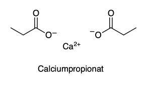 Struktur und EigenschaftenCalciumpropionat (C6H10CaO4, Mr = 186.22 g/mol) ist das Calciumsalz der Propionsäure. Es liegt als weisses, kristallines Pulver vor, das in Wasser leicht löslich ist. Die Propionsäure ist eine kurzkettige Fettsäure (SCFA).