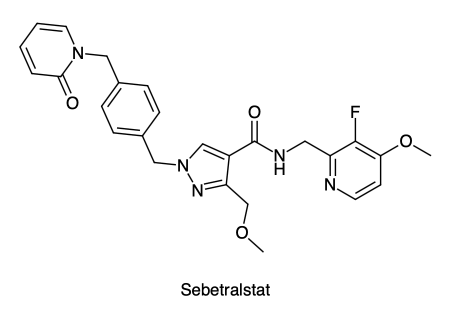 Struktur und EigenschaftenSebetralstat (C26H26FN5O4, Mr = 491.5 g/mol) ist ein fluoriertes Pyridin-, Pyrazol- und Oxopyridin-Derivat und ein Amid. Es liegt als weisses, kristallines Pulver vor, das in Wasser praktisch unlöslich ist.