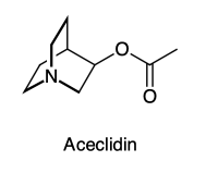 Struktur und EigenschaftenAceclidin (C9H15NO2, Mr = 169.2 g/mol) liegt im Arzneimittel als Aceclidinhydrochlorid vor. Es ist ein Essigsäure-Ester (Ace-) und ein Chinuclidin-Derivat (-clidin). Das Chinuclidin kommt auch in anderen Wirkstoffen vor, die am Parasympathikus aktiv sind. Ein Beispiel ist Aclidiniumbromid.