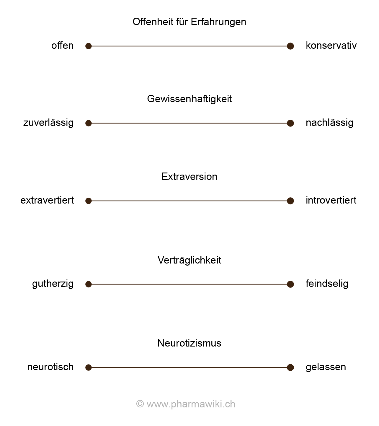 Faktoren des Big-Five-Modell (ohne Facetten), zum Ausprobieren und Experimentieren. Zum Vergrössern und Ausdrucken anklicken. Illustration © PharmaWiki