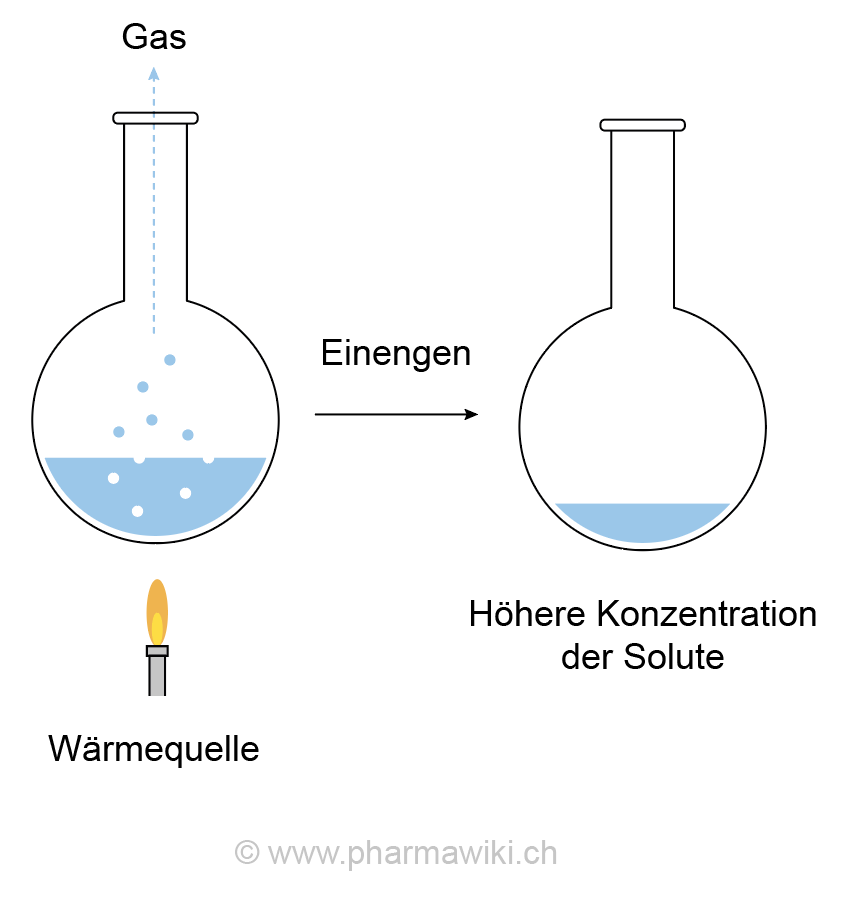 Definition und EigenschaftenEinengen bedeutet in der Chemie, dass einer Lösung ein Teil des Lösungsmittels entzogen wird, während die Menge der Solute konstant bleibt. Dadurch steigt die Konzentration der gelösten Substanzen. Das Einengen ist somit das Gegenteil einer Verdünnung. Beim Eindampfen wird das gesamte Lösungsmittel entfernt.