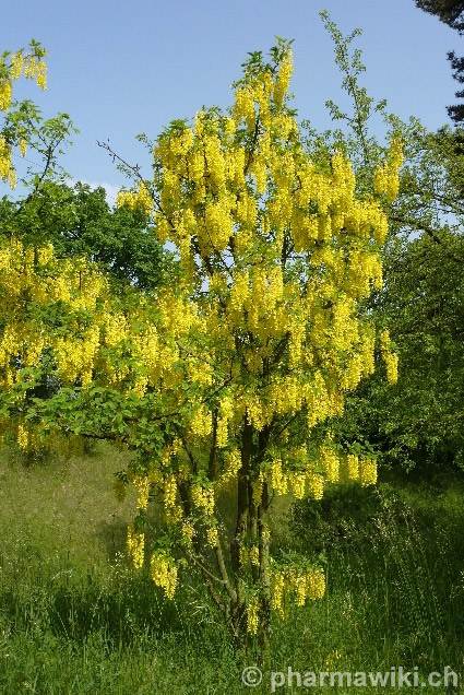 Der Gemeine Goldregen Laburnum anagyroides aus der Familie der Hülsenfrüchtler ist eine Zierpflanze, die aufgrund ihrer schönen, gelben und hängenden Blüten angepflanzt wird. Alle Pflanzenteile sind sehr giftig, insbesondere die Samen. Die relevanten Inhaltsstoffe sind Chinolizidin-Alkaloide wie Cytisin, das auch als Raucherentwöhnungsmittel verwendet wird und von dem der Wirkstoff Vareniclin (Champix®, ausser Handel) abgeleitet ist.