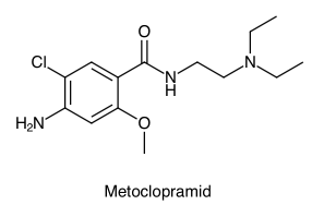 Struktur und EigenschaftenMetoclopramid (C14H22ClN3O2, Mr = 299.8 g/mol) ist ein Benzamid. Es liegt als weisses Pulver vor, das in Wasser praktisch unlöslich ist. Das auch verwendete Metoclopramidhydrochlorid ist in Wasser sehr leicht löslich. Metoclopramid ist ein strukturelles Analogon des Lokalanästhetikums Procain.