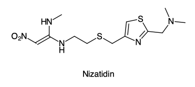 H2-Rezeptor-AntagonistenNizatidin ist ein Wirkstoff aus der Gruppe der H2-Rezeptor-Antagonisten zur Behandlung säurebedingter Erkrankungen wie Magen- und Darmgeschwüre und Ösophagitis. Die Wirkungen beruhen auf dem kompetitiven Antagonismus an H2-Rezeptoren und der Hemmung der Säuresekretion im Magen. Die Effekte halten bis zu 12 Stunden an. Zu den häufigsten möglichen unerwünschten Wirkungen gehören eine Anämie und eine Urticaria. Nizatidin interagiert nicht mit CYP450 und hat im Unterschied zu Cimetidin ein geringes Potential für Arzneimittel-Wechselwirkungen. synonym: Nizatidinum, LY139037