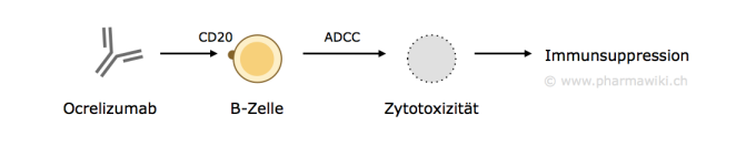 ) hat selektiv immunsuppressive und zytotoxische Eigenschaften. Der Antikörper bindet an B-Zellen mit dem CD20-Antigen auf der Oberfläche und führt zu einer Zellauflösung. Daraus resultiert eine B-Zell-Depletion. B-Zellen spielen eine wichtige Rolle bei der Myelin- und Nervenzellschädigung.