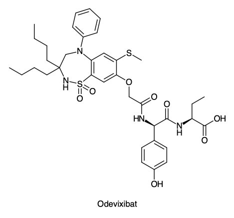 Struktur und EigenschaftenOdevixibat (C37H48N4O8S2, Mr = 740.90 g/mol) liegt im Arzneimittel als Odevixibat-Sesquihydrat vor, ein weisser Festkörper, dessen Löslichkeit sich mit steigendem pH-Wert erhöht.