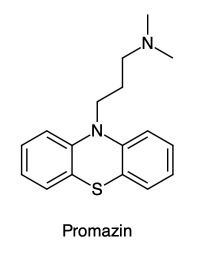 PhenothiazinePromazin ist ein Neuroleptikum aus der Gruppe der Phenothiazine, das zur Behandlung psychotischer Erkrankungen, zur Beruhigung und zur Behandlung von Übelkeit und Erbrechen eingesetzt wird. Die Wirkungen beruhen unter anderem auf dem Antagonismus an Dopamin-Rezeptoren. Die Tabletten können bis zu viermal täglich eingenommen werden. Zu den möglichen unerwünschten Wirkungen gehören unter anderem eine Gewichtszunahme, Schwindel, Kopfschmerzen, Dämpfung, Bewegungsstörungen, Sehstörungen, Pigmentablagerungen im Auge, ein Blutdruckabfall, Verdauungsstörungen, Mundtrockenheit, Verstopfung und Harnverhaltung. Promazin kann das QT-Intervall verlängern und Herzrhythmusstörungen verursachen.synonym: Promazinum, Promazini hydrochloridum PhEur, Promazinhydrochlorid