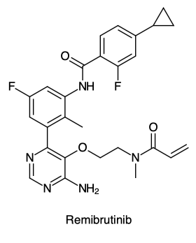 Struktur und EigenschaftenRemibrutinib (C27H27F2N5O3, Mr = 507.5 g/mol) liegt als weisses bis leicht gelbes Pulver vor und ist in Wasser praktisch unlöslich. Es ist ein fluoriertes Aminopyrimidin- und Benzamid-Derivat.