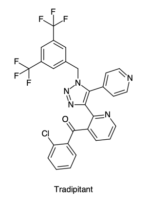Struktur und EigenschaftenTradipitant (C28H16ClF6N5O, Mr = 587.9 g/mol) ist ein chloriertes und fluoriertes Triazol- und Pyridin-Derivat. Es liegt als weisses, kristallines Pulver vor und ist in Wasser praktisch unlöslich.